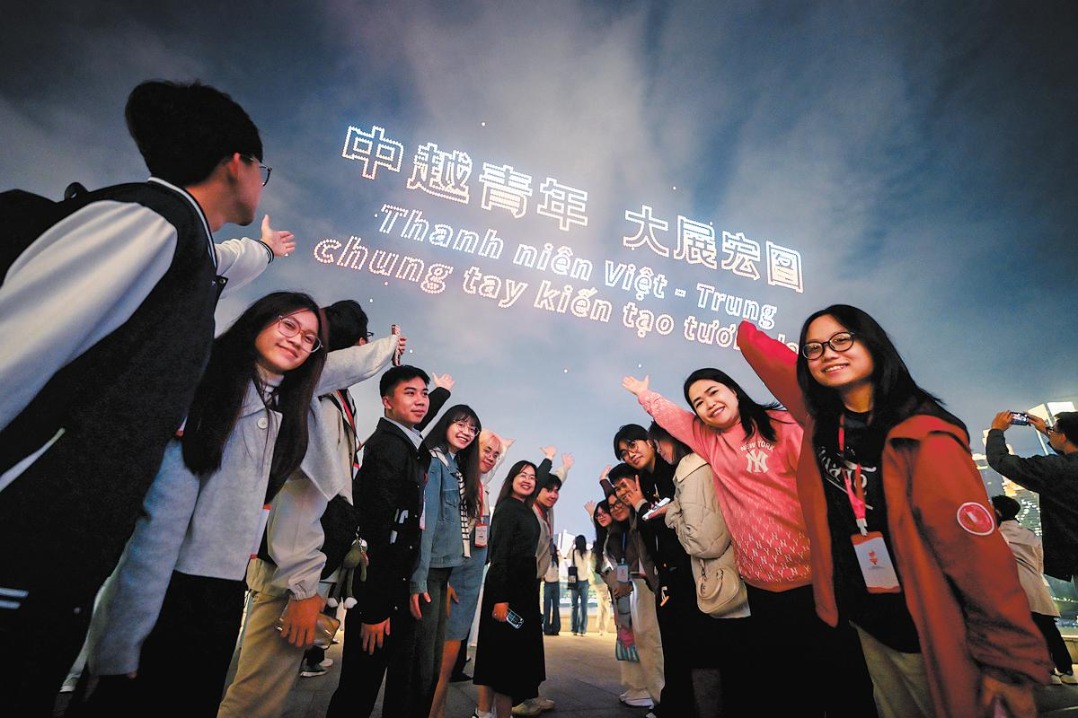 Китайски и виетнамски студенти позират по време на светлинно шоу с дрон в Чунцин на 15 ноември. [Photo provided to CHINA DAILY]