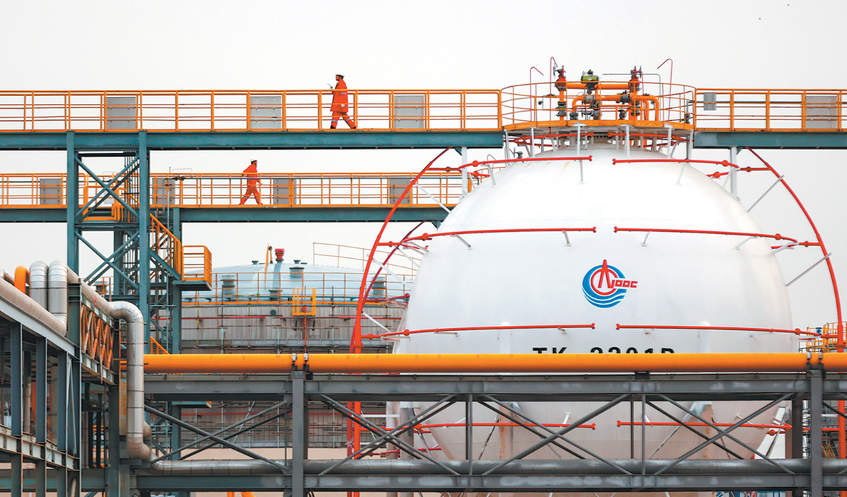 Служителите на CNOOC работят в съоръжение за преработка на нефт и газ в Тиендзин на 1 декември. DU PENGHUI/XINHUA