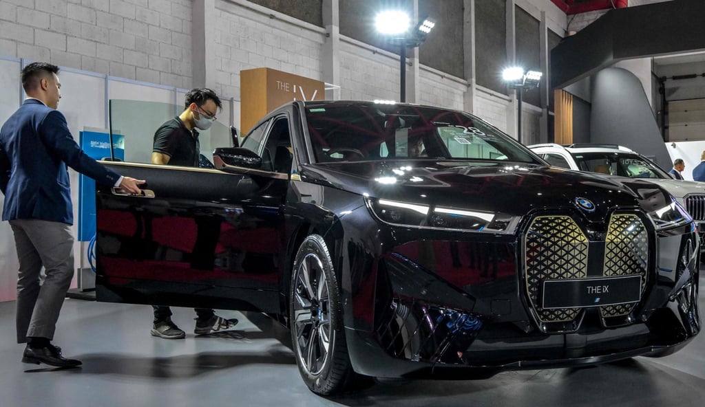 Посетител, придружен от асистент по продажбите, разглежда автомобила iX тип EV на BMW на Международното автомобилно изложение в Индонезия 2025 г. Снимка: AFP