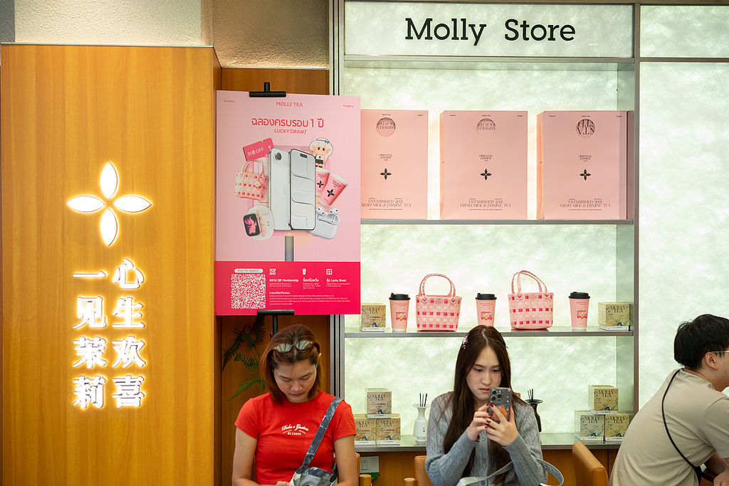 Клиенти чакат до лозунг на марка с китайски йероглифи в магазин за чай Molly на площад Siam в Банкок, Тайланд, на 7 октомври 2025 г. [Photo/VCG]