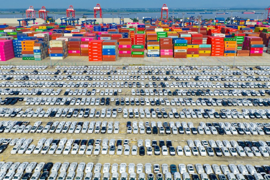 Въздушна снимка с дрон, направена на 4 октомври 2025 г., показва автомобили, готови за изпращане и износ в пристанищна зона в Нанкин, провинция Дзянсу в Източен Китай. [Photo/Xinhua]