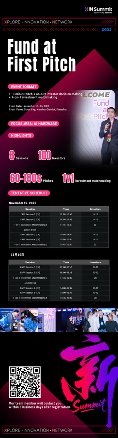 XIN Summit 2025, водещата международна конференция за интелигентни хардуерни иновации в Азия, ще бъде домакин на своето водещо инвестиционно и финансово събитие — Fund at First Pitch (FAFP) — в Шенжен за първи път на 15-16 ноември 2025 г.
