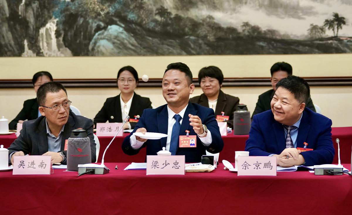 Liang Shaozhong, генерален мениджър на Shantou Jinghua Food Co Ltd, демонстрира подскачаща рибена топка по време на групова дискусия на годишната местна законодателна среща на провинция Гуангдонг в понеделник. [Photo provided to chinadaily.com.cn]