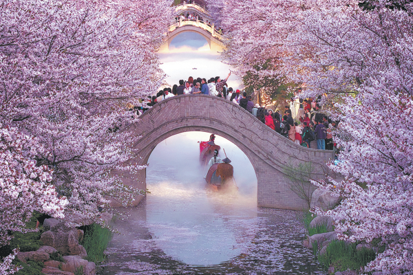 Разцъфнали черешови цветове привличат туристи в Нантонг, провинция Дзянсу по време на празника на фестивала Цинмин. СИНХУА