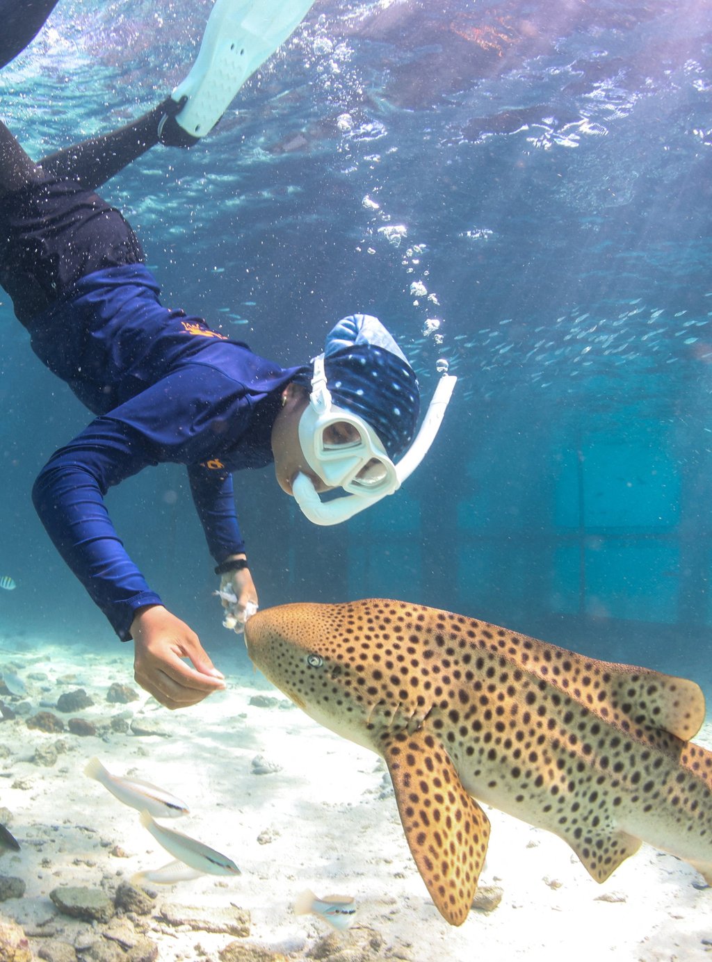 Бавачка на акула храни млада индо-тихоокеанска леопардова акула в морска кошара преди пускането й в дивата природа на 6 декември 2025 г. Снимка: Reuters