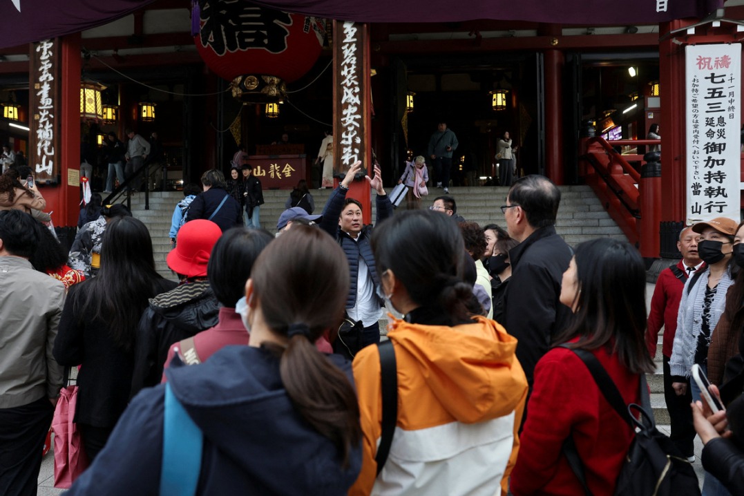 Китайска туристическа група е водена от екскурзовод в храма Сенсоджи, популярно място за разглеждане на забележителности в квартал Асакуса в Токио, Япония, 18 ноември 2025 г. REUTERS/Issei Kato