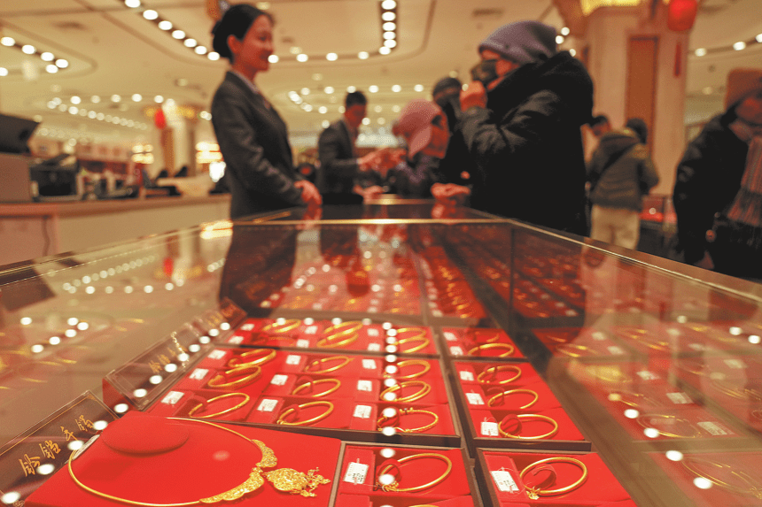 Потребителите разглеждат златни бижута в магазин в Пекин на 30 януари. ZHANG XIANGYI/CHINA NEWS SERVICE