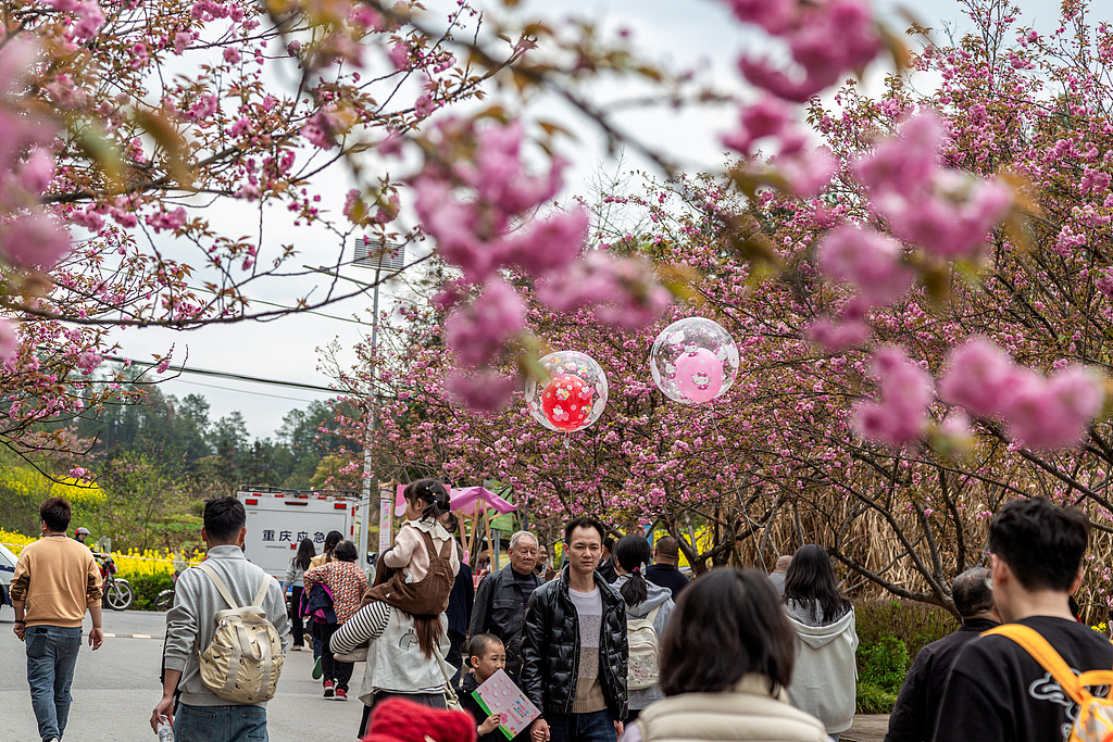 В село Jinlong, град Daguan в област Nanchuan, Chongqing, черешовите цветове са разцъфнали напълно, с хиляди розови цветове, създаващи спираща дъха сцена на фона на златни полета с рапица. Зашеметяващият пролетен пейзаж привлича тълпи от посетители, нетърпеливи да се насладят на красотата и да уловят мига на пролетта.