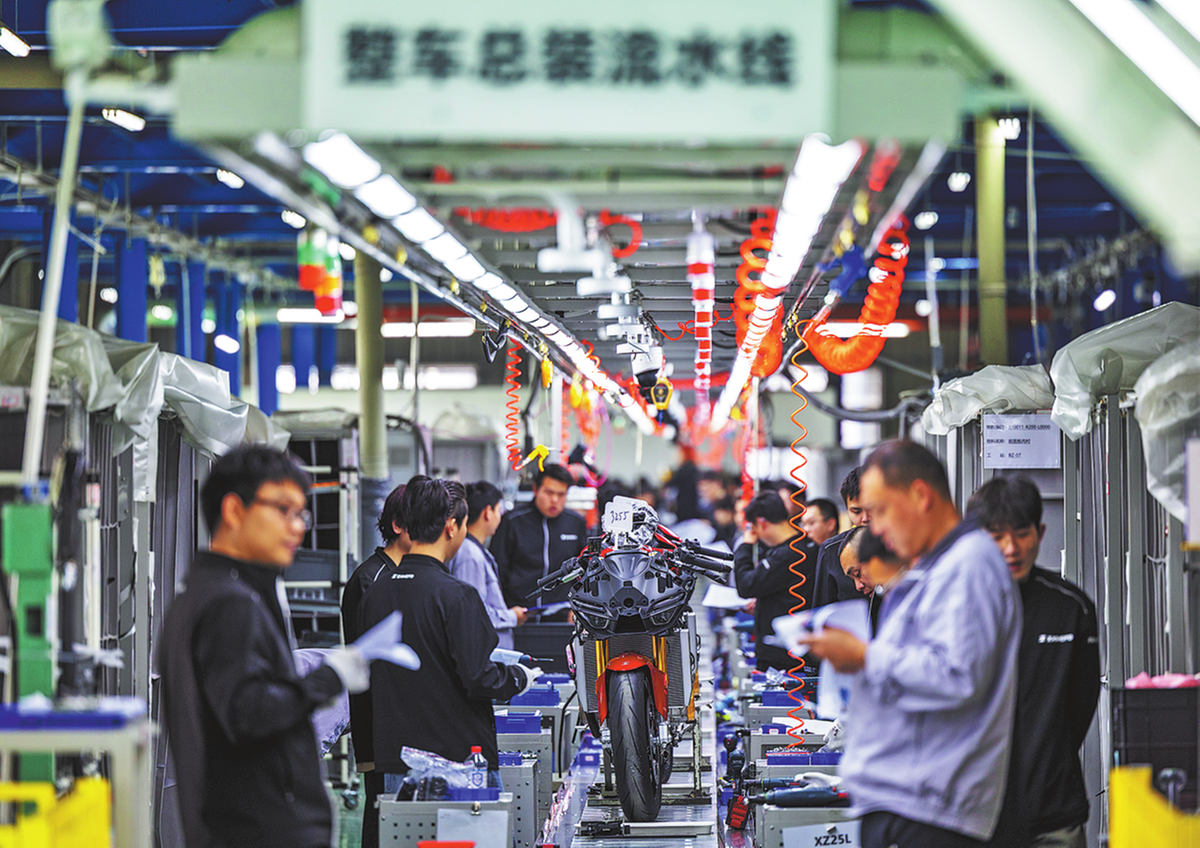 Служители работят на поточна линия за мотоциклети в Чунцин на 1 април. HUANG WEI/XINHUA